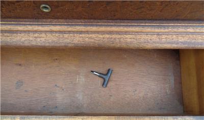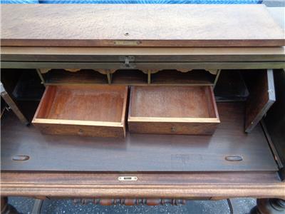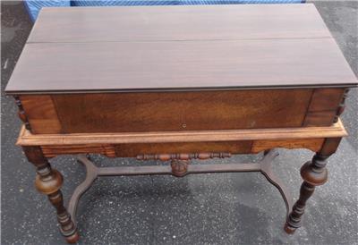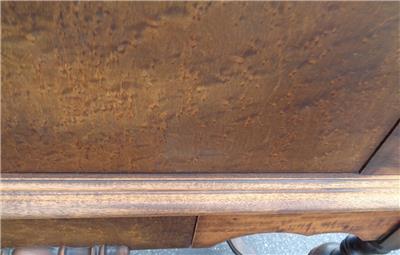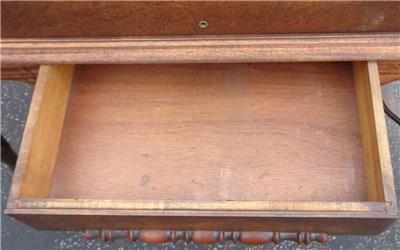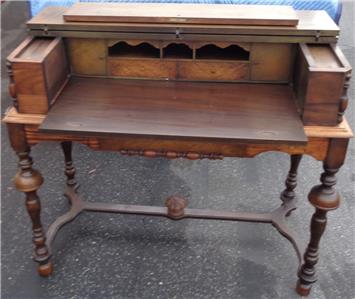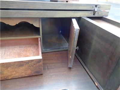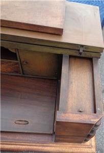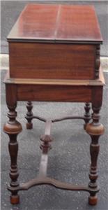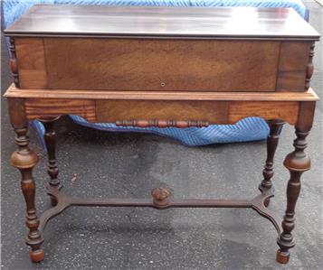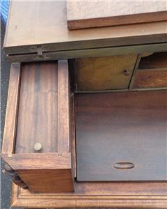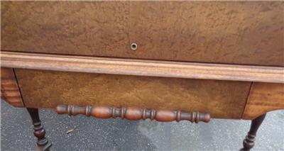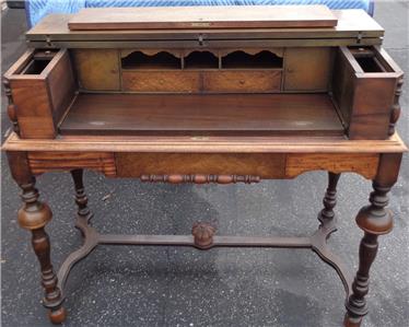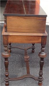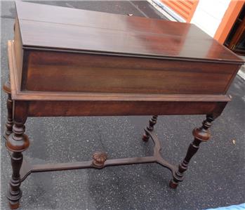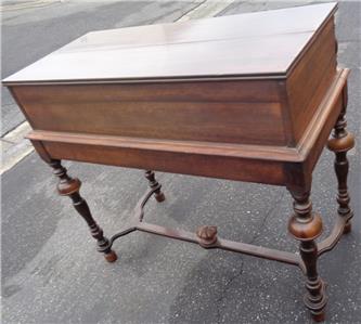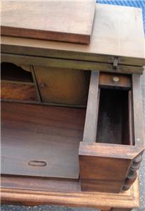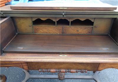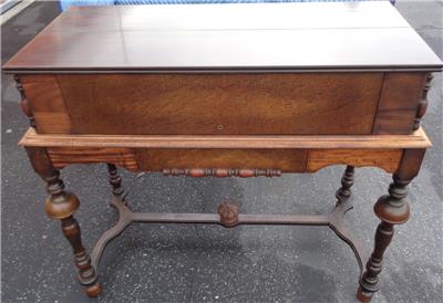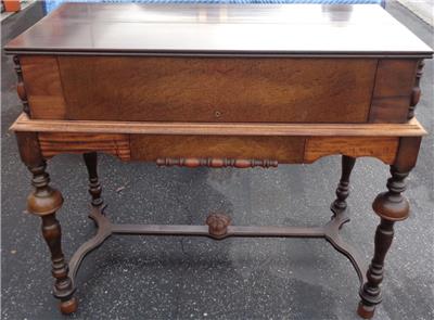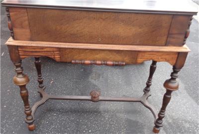 Offered here is this Amazing Antique Spinet Desk. It is made of solid wood, although I am not sure of the type of wood. It has some sections that look crosscut, other sections are burled, and the entire piece has a gorgeous finish and beautifully detailed grain. I am unsure of the age of the desk but would guess that it dates to the 19th Century. It is lockable, and has a key with it, although the key is not the original one. The desk has a writing surface that manually slides out for use, and in for storage when the desk is closed. It has a box compartment on each end that both have sliding lids, and other compartments inside as well as drawers. There are tiny pin holes at the back of the desktop, like there was once some type of trim piece there that is now gone. These holes are barely visible. The little decorative knob at the bottom in the center of the spacer supports is not original to the piece but adds a nice decorative touch. The desk is in amazing condition for such an old piece. There are some light surface scratches and dings on it in a few spots, but no major damage, and the finish is gorgeous. The desk has one tiny little nick in the trim wood on the back side. This is pictured in the photos. The desk drawers are joined with what I believe are rabbit joints. The desk is 36.5” tall, 42” wide including the decorative trim, 40” wide across the top, 19.75” deep at the trim, 18” deep at the top, 20” deep at the legs, and the writing surface is at about 29.5” high. This is an amazing, beautiful antique Spinet Desk. It would be a gorgeous addition to any antique furniture collection and is completely functional as well.