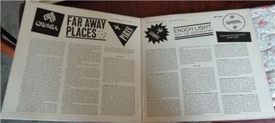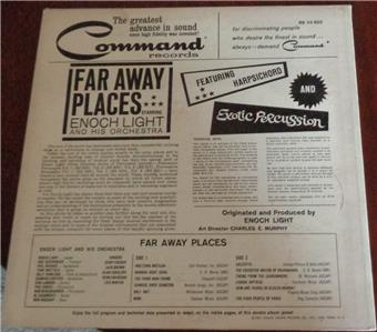 Offered here is this nice vintage full Length LP Vinyl Record, Far Away Places, featuring Enoch Light and His Orchestra, with Harpsichord and Exotic Percussion. The record is a Grand Award record and plays at 33.3 speed. It is in good condition but does have some light scratches on it. I do not own a record player, so the record has not been tested. It is a 12” vinyl record. It would be a wonderful addition to any vintage vinyl collection. It features the songs;