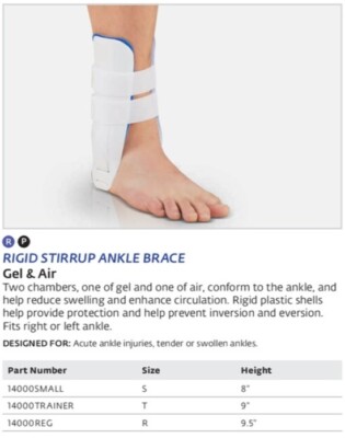 -Ankle brace.-Top bladder comes pre-filled will air.-Bottom bladder can be used for cold therapy.-Rigid thermoplastic shells with adjustable heel strap.-Recommended for acute injuries, or for tender and swollen ankles.-Two compartments, one of gel, and one of air, which conform to the ankle.-Helping to ensure the patient receives a more comfortable fit.-