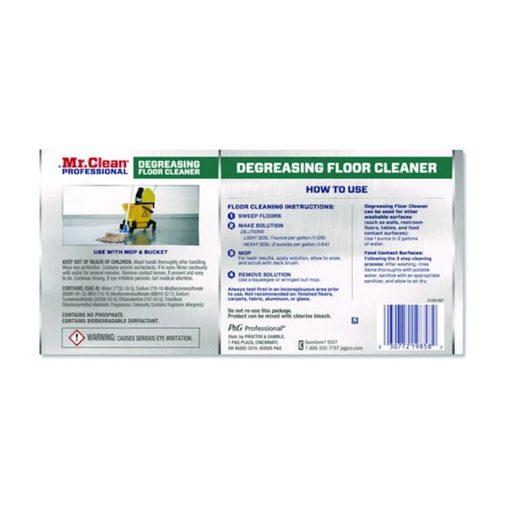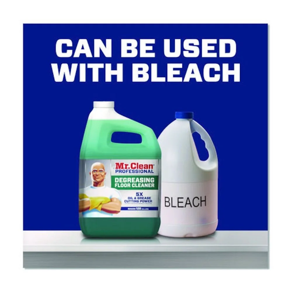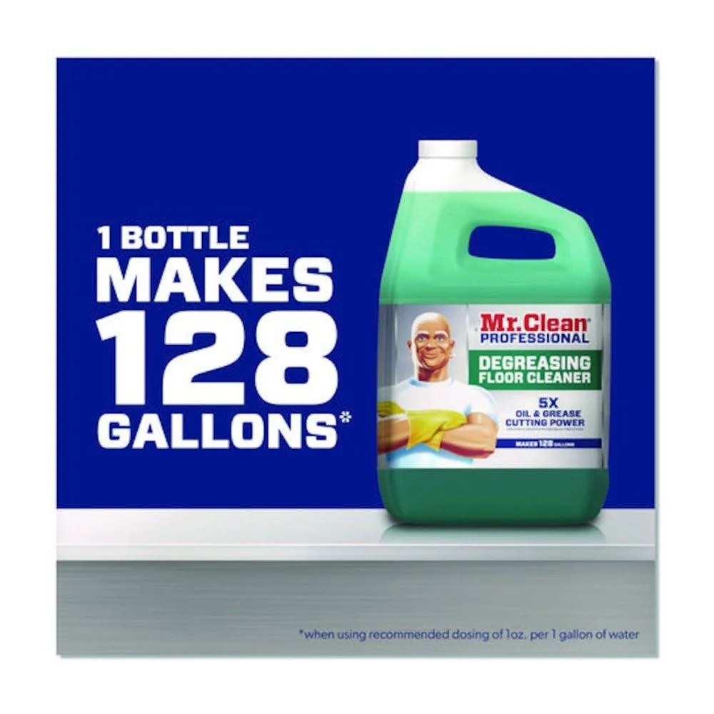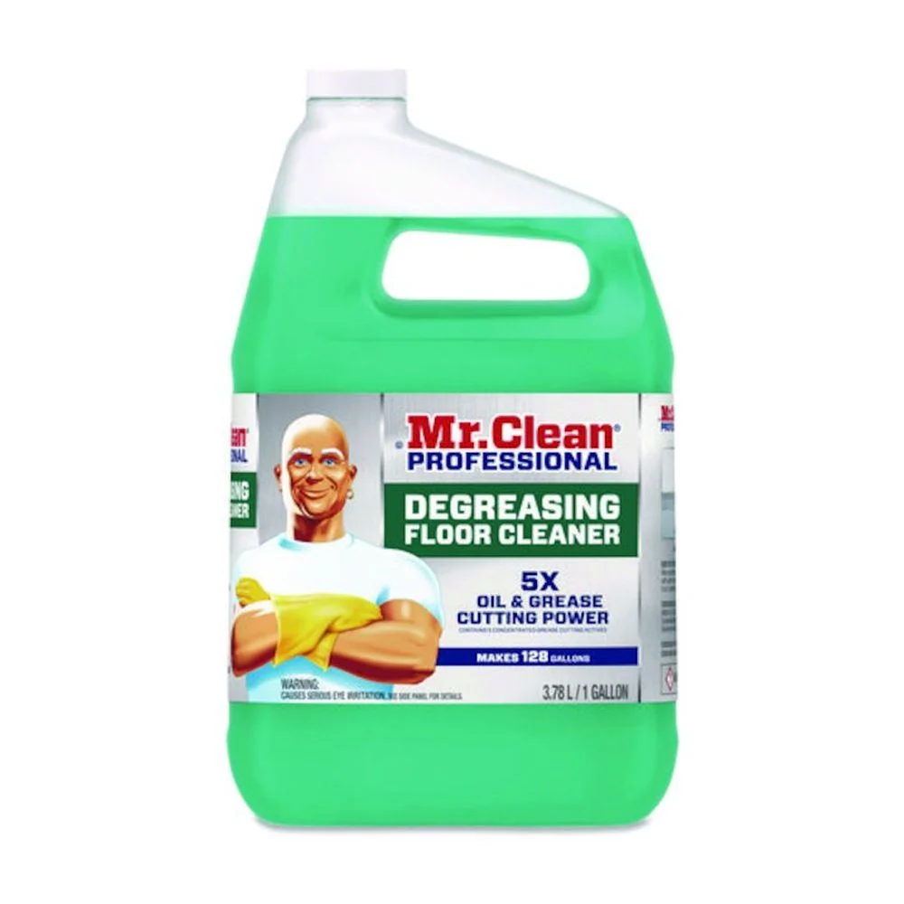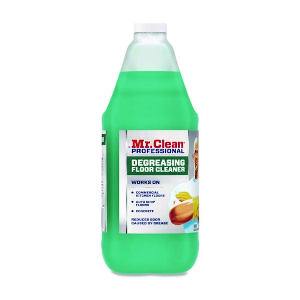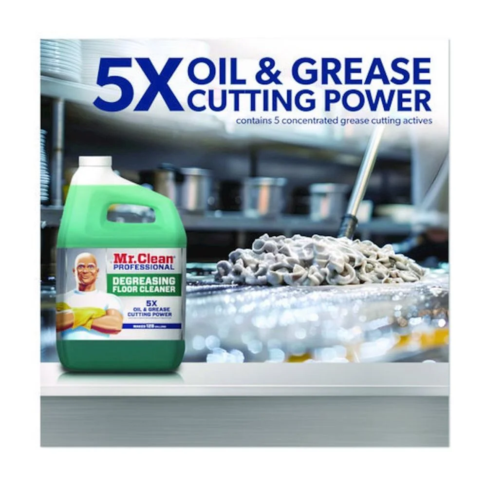Mr. Clean® Professional Degreasing Floor Cleaner is a powerful cleaner on greasy floors in commercial kitchens, auto-shops, concrete and more. Has five times the oil and grease cutting power with five concentrated grease cutting actives.