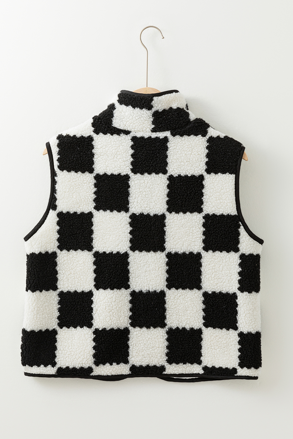 | Black Checkered Sherpa Collared Jacket Vest • This winter vest is warm and soft with Sherpa made. • The checkered pattern makes it chic and popular. • It’s cozy fit with a full zipper and stand collar. • This Sherpa vest is perfect for layering. | Material: 100% Polyester Silhouette: Shift Style: Casual | Sleeve Length: Sleeveless Details: Zipper Pattern: Plaid | Occasion: Daily Neckline: Turn-down Collar | |