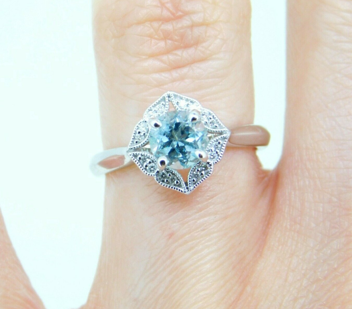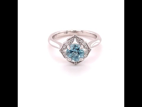 14k white gold ring featuring a light sky blue tourmaline and diamonds. The round tourmaline weighs .94 carats and measures about 6mm. It is accented by sixteen round diamonds measuring about 1mm and weighing about .10cts total.