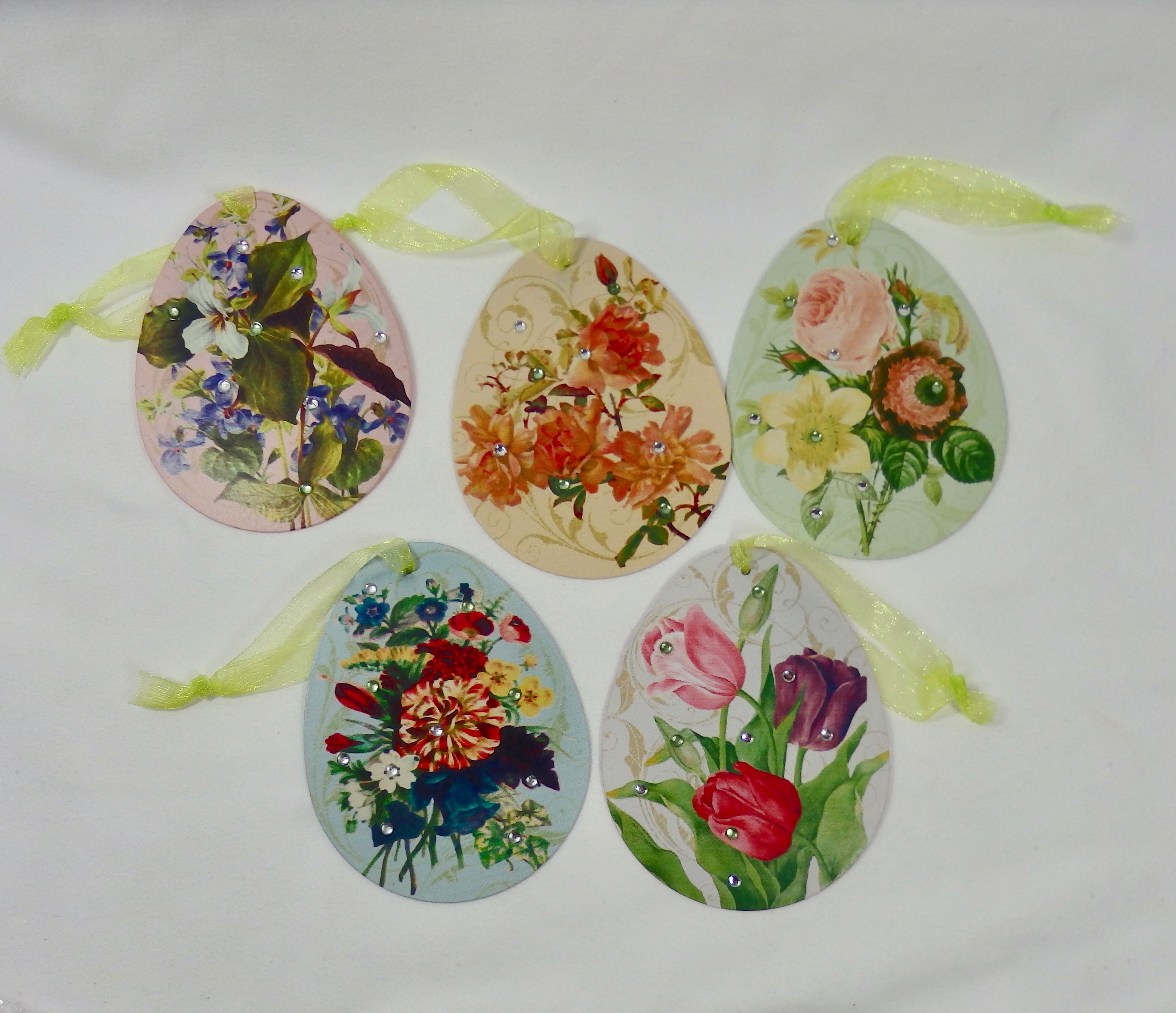 Floral design with rhinestone accents on front, back is the base color of the egg.