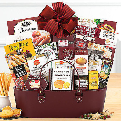 Spread joy with this gift basket filled with plenty to share. Ghirardelli dark chocolate, vanilla fudge with sea salt, garlic crackers, smoked Gouda cheese spread, sundried tomato and cheese baguettes, chocolate coconut macaroons, Lily O'Brien's sticky toffee, a Godiva dark chocolate ganache bar, strawberry meringue cookies, pretzel sticks, sweet and spicy honey mustard dip, Lindt milk chocolate truffles and much more are impossible to resist.