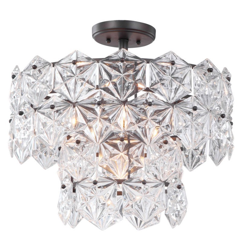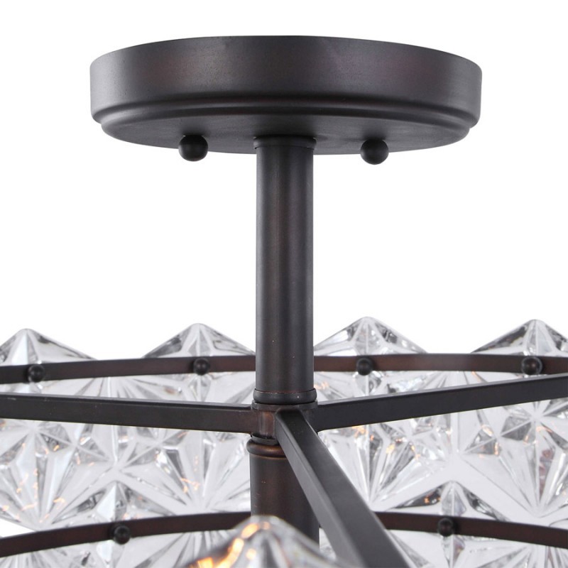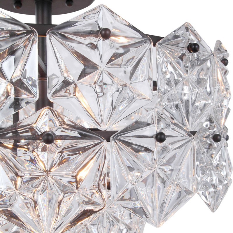 Clear pressed glass gives this 6 Lt. semi flush its sparkle with inspiration from Kalmar glass looks. The body is finished in a complimentary bronze metal finish. Supplied with 5-60 watt max candelabra sockets and 1-60 watt max Edison down-light socket. This one of a kind lighting fixture will bring light and modern design to any space.