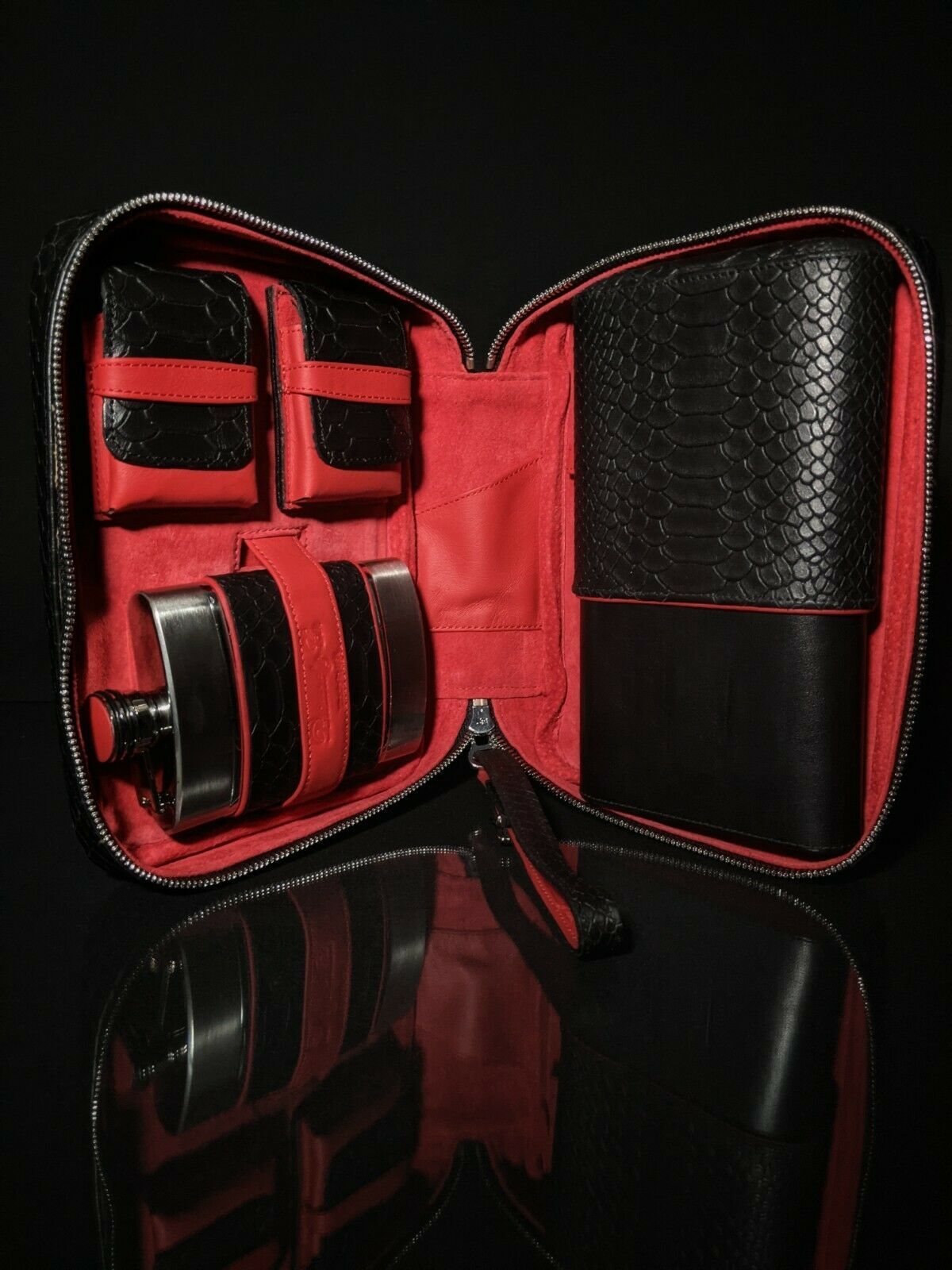 Connected via magnetic system, the cigar case, lighter and cutter pouches are removable, while the flask fits in a snug leather pocket that can be used to hold a cell phone, wallet or eye wear.