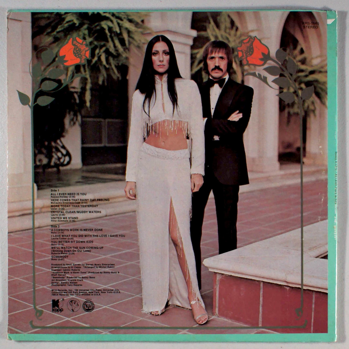 All I Ever Need Is You by Sonny Cher reached number 14 on the Billboard chart and was certified Gold for the sales of 500,000 copies. The album was released in the beginning of 1972 and reached at No. 14 on on the Billboard Albums Chart. The title track was a top ten hit, reaching No. 7 on the US Hot 100 chart, and a No. 1 on the Adult Contemporary chart. The next single, A Cowboy's Work Is Never Done also became a top ten hit, reaching No. 8 on the US Hot 100. Its top 40 follow-up single, When You Say Love, was not taken from this LP but its B-side Crystal Clear/Muddy Waters was. The only song performed by Bono solo was You Better Sit Down Kids, which was previously a top ten solo hit by Cher.