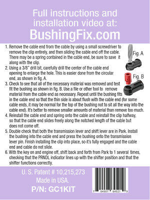 This GC1KIT2 (US Patent # 10,215,273 US Patent # 10,619,723) allows you to quickly and easily repair your automatic transmission shift cable by repairing the cable end that attaches to the transmission shift lever. This particular cable style does not have a bushing but rather plastic prongs that break over time. Our patented replacement sleeve comes complete with replacement prongs and ensures a quality repair with ease. A professional can perform this repair in under 5 minutes, average time for a non-professional is less than 15 minutes. This kit is made from a material that was designed to outlast the factory cable end. BushingFix GC1KIT- Transmission Shift Cable Bushing Repair Kit ; (US Patent # 10,215,273 and US Patent # 10,619,723); fitment and catalogue Copyrighted (TX-8-931-983)