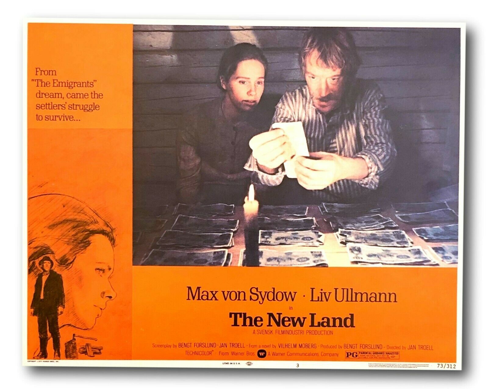 Looking for the next great piece to add to your memorabilia collection? Well, this is it! " The New Land rdquo; Starring: Max von Sydow, Liv Ullmann, Monica Zetterlund, Eddie Axberg Copyright Year / Dated: 1973 11" X 14" in size Not a bootleg or reproduction - GUARANTEED Original movie studio production theatrical lobby card used in a movie theater around time of release of the movie. Condition: Poster is in -vintage condition- and of investment quality. This original lobby card was used at a movie theater. It may or may not have staple marks at corners, wrinkling, slight tears around edges, rounded corners, etc. From being originally displayed at a movie theater or overtime natural wear. Colors and detail are outstanding for this day amp; age, photos may not completely pick up high quality of coloring and inks until you see in hand. Please make your personal assessment of the condition of this poster from the photos provided in the listing. The above condition issues are not exact for this poster, so please take a look at the photos to determine the condition. We ship our items very protected and secure to make sure this item makes it to you safely!!