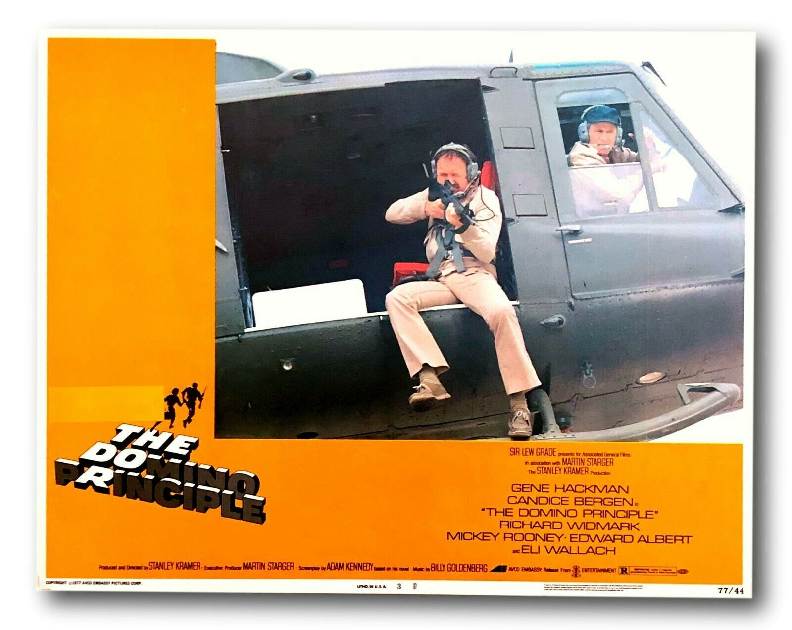 Looking for the next great piece to add to your memorabilia collection? Well, this is it! " The Domino Principle rdquo; Starring: Gene Hackman, Candice Bergen, Richard Widmark , Mickey Rooney Copyright Year / Dated: 1977 11" X 14" in size Not a bootleg or reproduction - GUARANTEED Original movie studio production theatrical lobby card used in a movie theater around time of release of the movie. Condition: Poster is in -vintage condition- and of investment quality. This original lobby card was used at a movie theater. It may or may not have staple marks at corners, wrinkling, slight tears around edges, rounded corners, etc. From being originally displayed at a movie theater or overtime natural wear. Colors and detail are outstanding for this day amp; age, photos may not completely pick up high quality of coloring and inks until you see in hand. Please make your personal assessment of the condition of this poster from the photos provided in the listing. The above condition issues are not exact for this poster, so please take a look at the photos to determine the condition. We ship our items very protected and secure to make sure this item makes it to you safely!!