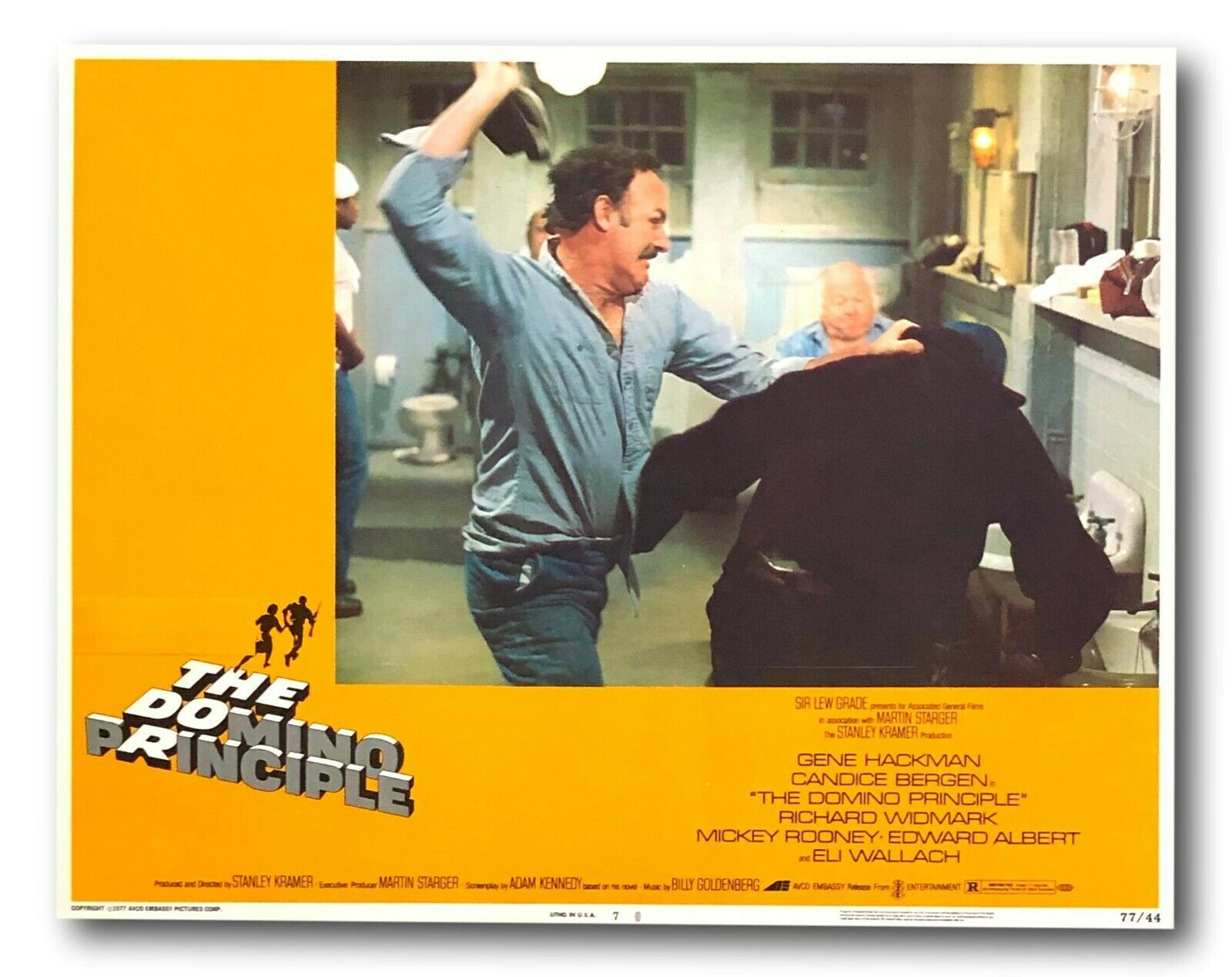 Looking for the next great piece to add to your memorabilia collection? Well, this is it! " The Domino Principle rdquo; Starring: Gene Hackman, Candice Bergen, Richard Widmark , Mickey Rooney Copyright Year / Dated: 1977 11" X 14" in size Not a bootleg or reproduction - GUARANTEED Original movie studio production theatrical lobby card used in a movie theater around time of release of the movie. Condition: Poster is in -vintage condition- and of investment quality. This original lobby card was used at a movie theater. It may or may not have staple marks at corners, wrinkling, slight tears around edges, rounded corners, etc. From being originally displayed at a movie theater or overtime natural wear. Colors and detail are outstanding for this day amp; age, photos may not completely pick up high quality of coloring and inks until you see in hand. Please make your personal assessment of the condition of this poster from the photos provided in the listing. The above condition issues are not exact for this poster, so please take a look at the photos to determine the condition. We ship our items very protected and secure to make sure this item makes it to you safely!!