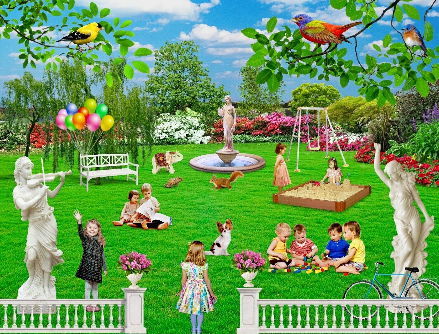 Landscape with ?hildren play in kindergarten Jigsaw puzzle 500 pieces boardgame for any age and for any holiday.