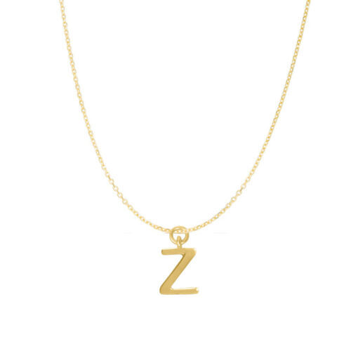 Initials are a classic piece of jewelry that never goes out of style. This design features a classic text style featuring a small initial ?Z? in 14-karat yellow gold plated sterling silver. The small pendant measures approximately 3/8? long. There will be a 14/20 gold filled cable chain necklace that is 1.5mm wide added to the pendant. The gold chain has a spring ring closure and comes individually carded in 16, 18, 20, and 24 inches long.