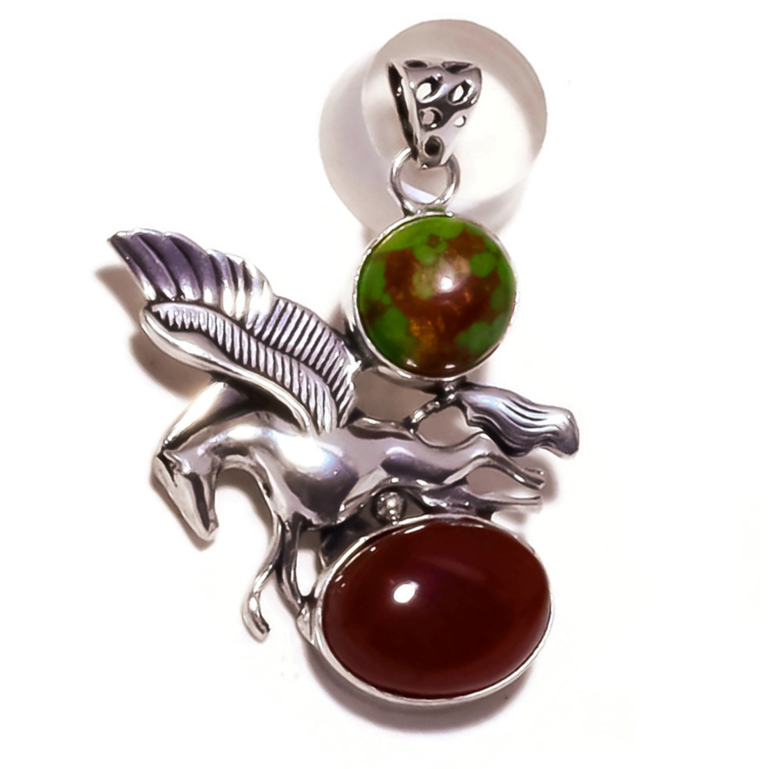 Green Turquoise, Carnelian Gemstone 925 Silver Overlay Handmade Flying Horse Pendant