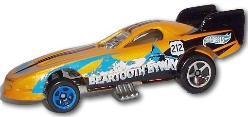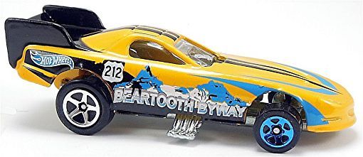 Description: Dark Goldenrod w/Unpainted interior; Clear window; Black Blue stripes on sides; Black stripes across top; Blue stripes on hood; 'Beartooth Byway' mountain deco on sides w/Blue White ‘Hot Wheels’ logo; Hinged body; Unpainted Malaysia base w/BlueChr5SP’s (Front) Chr5SP’s (Rear). 041821-041821P-D45