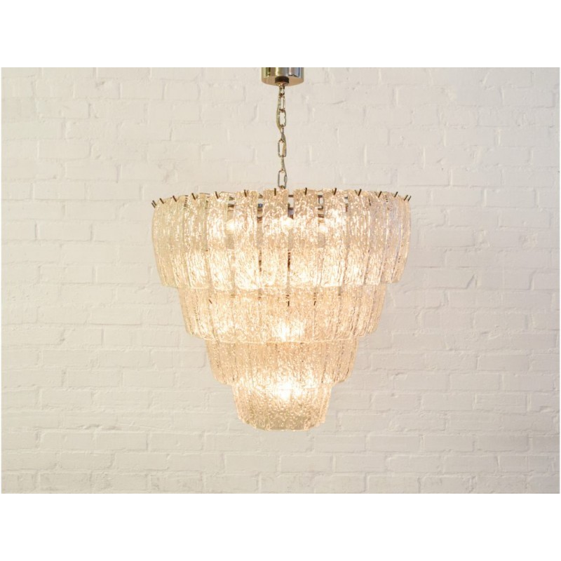 Venetian crystal glass – hand cast to recreate the sensual light play of warm summer sun on the lazy waters of a Venice canal – cascades in undulating tiers to create a classic silhouette. Always alluring, always in style.