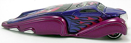 Description: Mtlflk Purple w/Black interior; Clear windows; Pink, Purple, White, Black design across top; Purple flames on sides; Magenta fenders; ‘Hot Wheels’ Halloween logo on roof; Chrome Thailand base w/ChrSK5’s (Front) Chr5SP’s (Rear). 042421-042421P-D45