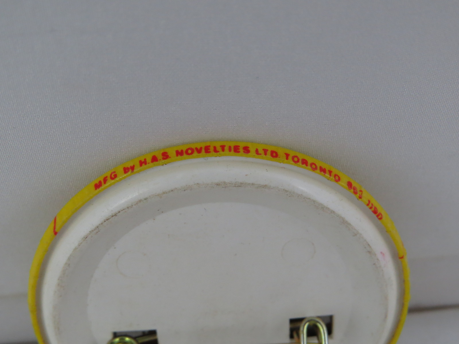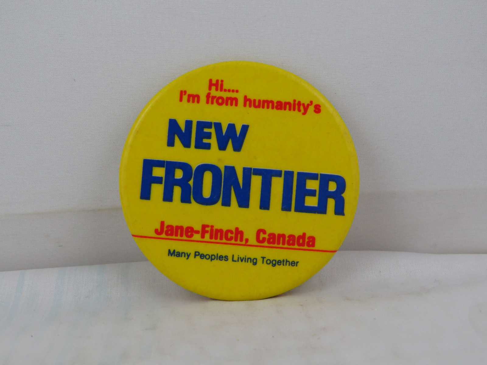 Up for sale is a vintage community pin. It is for the Jane/Finch group of Toronto. The pin has a yellow base colour and the wording, Hi I'm from Humanity's new frontier screened on in red and blue. What a great addition to any collection.