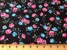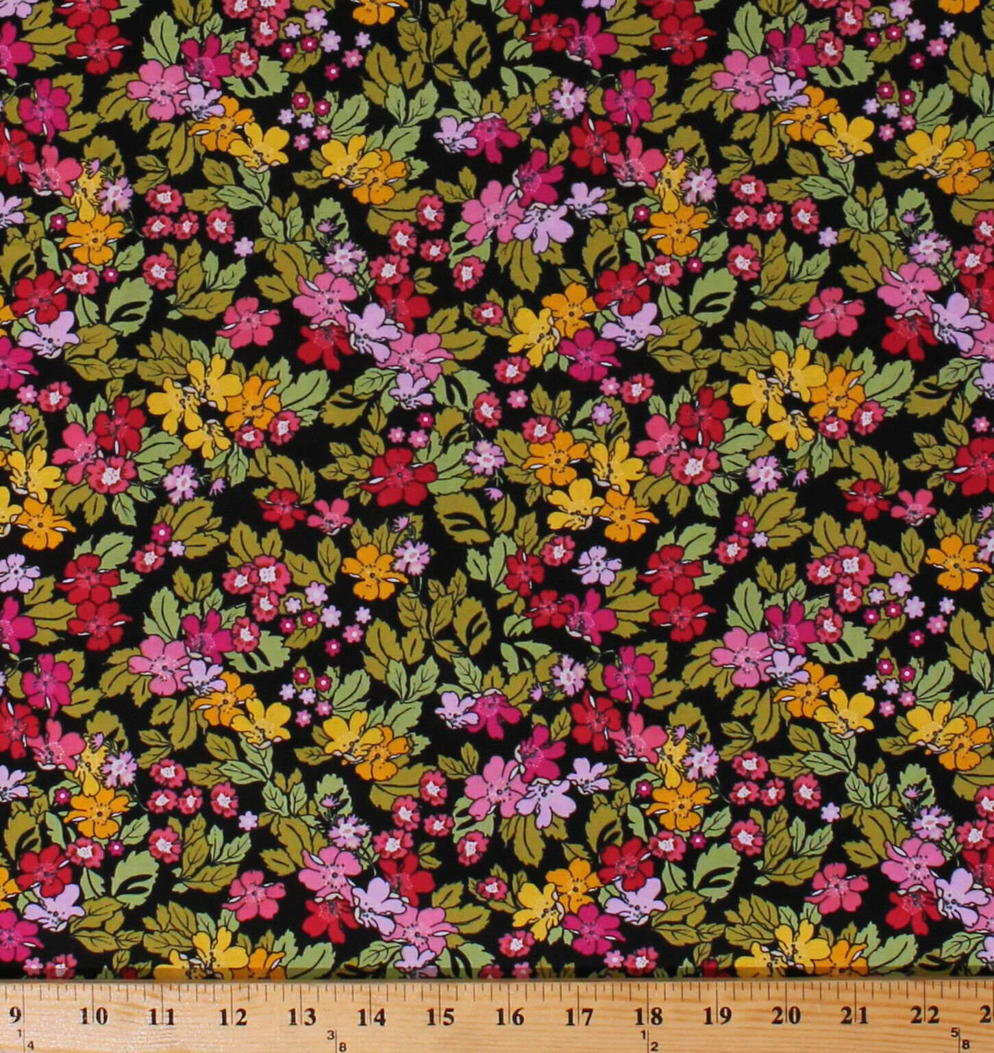 Cotton Leonora's Flowers Pink Yellow Green on Black Fabric Print by Yard D152.01