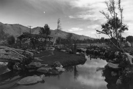 12inch x 18inch Poster Japanese-style garden with pool at dusk with mountains in the background and moon. Ansel Easton Adams (1902 ? 1984) was an American photographer, best known for his black-and-white photographs of the American West. During part of his career, he was hired by the US Government to record life in the West. - There is a border around the image. Image size is correct.