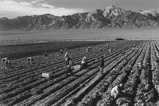 12inch x 18inch Poster Farm workers harvesting crops in field, mountains in the background. Ansel Easton Adams (1902 ? 1984) was an American photographer, best known for his black-and-white photographs of the American West. During part of his career, he was hired by the US Government to record life in the West. - There is a border around the image. Image size is correct.