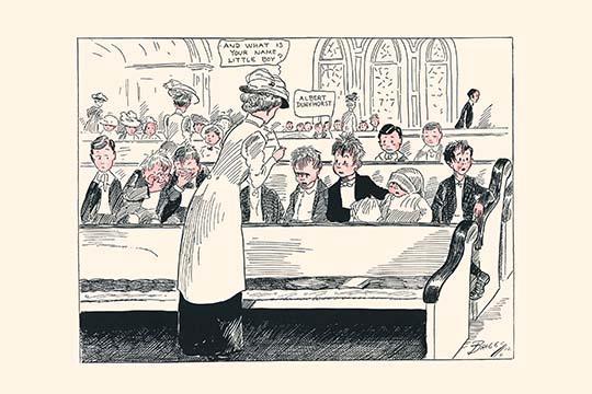 12inch x 18inch Poster A cartoon of children being forced to behave in church because the Christmas holiday is approaching and their attendance being recorded. The cartoon was drawn by Clare Briggs for the book "Oh Skin-nay! The Days of Real Sport" in 1913. The book was written by poet Wilbur D. Nesbit and portrays a year in the life of small-town America through the eyes of the twelve-year-old boy - wood gathering, sleigh rides, games of post office, swimming holes, and sandlot ball games. - There is a border around the image. Image size is correct.