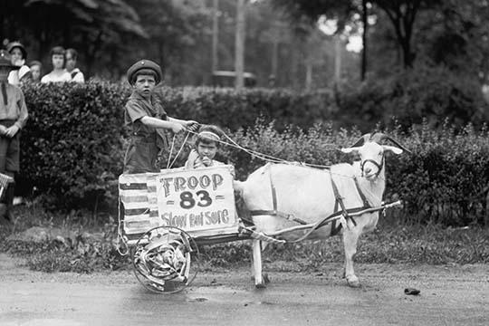 12inch x 18inch Poster Goat Pulls Young Boys Cart in the Tacoma Festival marked Troop 83; Baby on Board - There is a border around the image. Image size is correct.