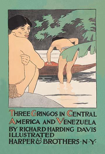 12inch x 18inch Poster Edward Penfield (1866-1925) was prolific illustrator for many American publications like Harpers, Scribner's, Colliers, and Saturday Evening Post. This book poster advertising the publication shows two indigenous men. One man is standing in water, leaning over a canoe; the other man is sitting on a rock. There is a border around the image. The image size is correct.