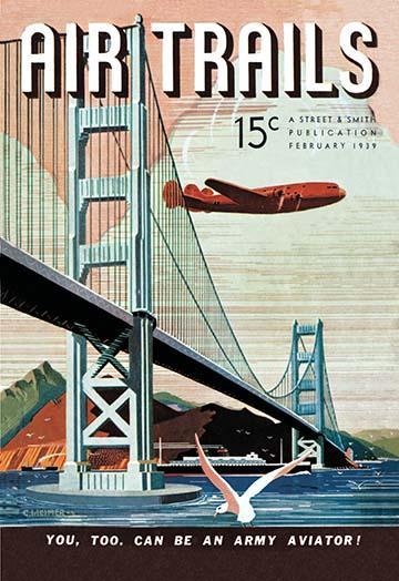 12inch x 18inch Poster Travel Leisure during the Heyday of Commercial Air Travel when Flying was exciting and foreign locations exotic. Cover for the September 1939 issue of Air Trails magazine. As a wartime publication, space was dedicated to recruiting for the Army Air Corps, pre-cursor to the Air Force. The image shows a large cargo plane flying over the Golden Gate bridge and a cruise ship sailing underneath. There is a border around the image. The image size is correct.