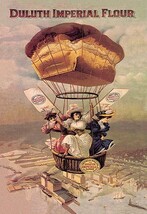 12inch x 18inch Poster Duluth Imperial Flour - Loaf of Bread Rises above the Minnesota skyline and the Mississippi River at Duluth carrying women in the basket. The image was used on print ads as well with the following poem attached, ?As our airship proudly raises / on high we hear the praises / and our song the world amazes / By its truth, / For we sing of product cereal / Which makes our bread ethereal / And is known as flour ?imperial? / From Duluth.? The mill was operational from 1889 to 1905. There is a border around the image. The image size is correct.