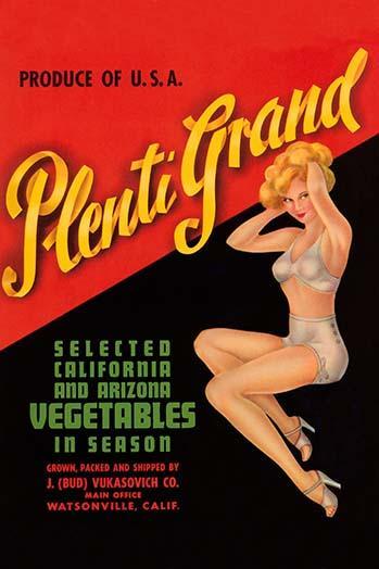 12inch x 18inch Poster This label features a pin-up girl. It was made for the J. (Bud) Vukasovich co. for packing its seasonal vegetables from Arizona or California. The use of the sexy woman was to make their brand stick in the mind of their buyers. Vegetable and Fruit crate labels were produced between the 1890's and 1950's to highlight one brand over another and increase sales in a market with fierce competition. Printed cardboard boxes made this art form obsolete. - There is a border around the image. Image size is correct.