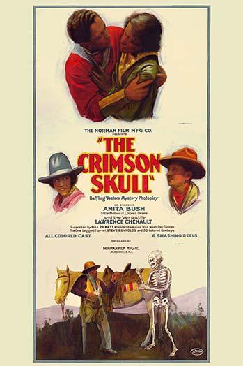 12inch x 18inch Poster Three panel motion picture poster for "The Crimson Skull" showing, in the top panel, a woman resisting the embrace of a man attempting to kiss her; in the middle panel appear the title and credits along with bust portraits of "Anita Bush" and "Lawrence Chennault"; the bottom panel shows "the one legged marvel, Steve Reynolds" holding a bottle of liquor and standing next to a horse, and Death, as a skeleton, standing at the rear end of the horse, facing Reynolds and gesturing for him to come; at the top of the bottom panel appears: Norman Film MFG. Co. Jacksonville, Fla. - There is a border around the image. Image size is correct.