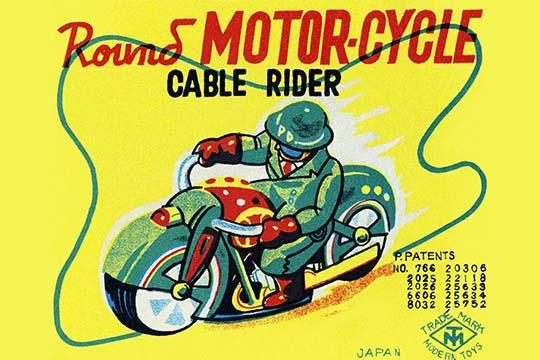 12inch x 18inch Poster A old tin toy with a motorcycle that would race around on a small metal cable. The Police Department motorcycle adorns this tin toy box to attract the attention of children looking for the perfect toy. - There is a border around the image. Image size is correct.