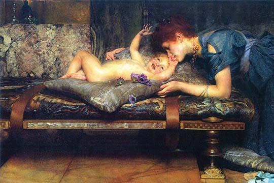 12inch x 18inch Poster A nude baby rests on a classical bed while the mother kneels over and kisses the child - There is a border around the image. Image size is correct.