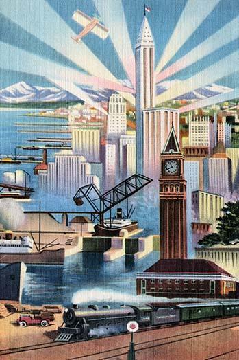 12inch x 18inch Poster An art deco linen postcard featuring a metropolis and all the elements of modern society and its technology. From trains to planes, from dockyards to skyscrapers, ships, cars, and everything imbetween. - There is a border around the image. Image size is correct.