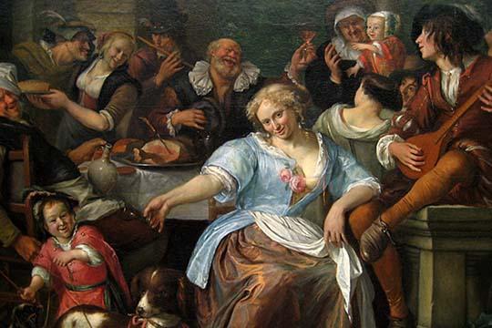 12inch x 18inch Poster Merry Company on a Terrace, ca. 1673?75; Steen casts himself as the inebriated innkeeper on the left. The artist's second wife, Maria, probably modeled for the provocatively posed hostess (she wears an apron) in the center. Her glass and the fat man's jug are sexually suggestive, but the woman's familiarity with the young musician and the shape of his cittern suggest that he has more to offer her. The overdressed boy serves as a marginal remark about the adults' behavior: a bridled horse and a whip usually stand for Temperance, but not when hitched to a spoiled brat and his indignant dog. The man with a sausage pinned to his hat is Hans Wurst, a fool familiar from the comic stage. - There is a border around the image. Image size is correct.