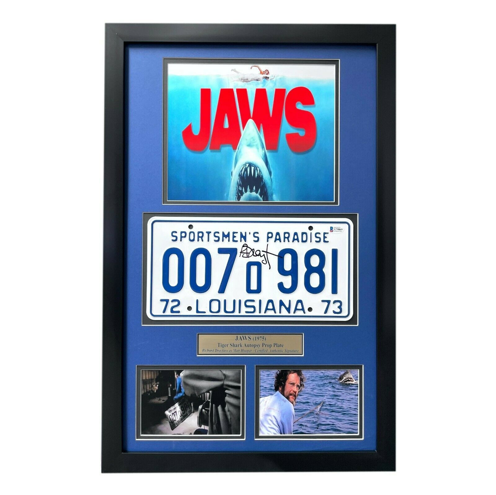 Looking for the next big thing to add to your memorabilia collection? Well this is it! Richard Dreyfuss Hand Signed "JAWS" framed licensed plate collage!! This is a must-have for the man cave as the collage features an actual autograph of Dreyfuss on the license plate as seen in the Tiger Shark Autopsy scene where Dreyfuss' character (Matt Hooper) removes this plate from the sharks stomach in the 1975 movie!! The replica metal license plate is a full-size license plate you would see on any vehicle on the road and measures approx 12" x 6" in size. Please note this license plate is not screen used just a replica of the one you would see in a movie. If you are a big fan of this movie and are looking to put a great piece on your wall, then this is it! This professionally custom framed collage features a 8x10 amp; 4x6 photos, a laser engraved nameplate depicting information about the "movie car", museum-quality matting amp; a glass display with a black frame measuring approximately 17" x 28" in size! This autograph is certified authentic by Beckett Authentication Services (BAS), one of the largest amp; most reputable authenticators in the industry. This piece includes the BAS tamper-proof authentication sticker and identification card directly from them, which can also be accessed anytime/anywhere on their online database on their website. Note: The item listed in this listing is a stock item and you will receive a comparable item to the one pictured. Autograph amp; inscription locations may vary as well as the size and signature quality.