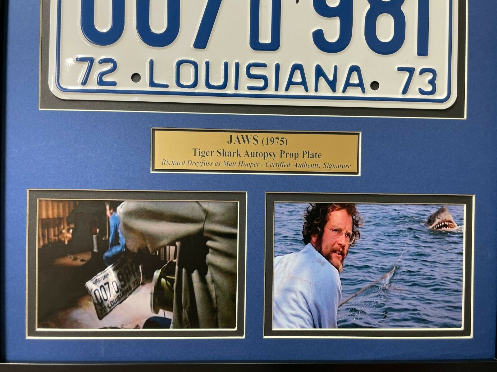 Looking for the next big thing to add to your memorabilia collection? Well this is it! Richard Dreyfuss Hand Signed "JAWS" framed licensed plate collage!! This is a must-have for the man cave as the collage features an actual autograph of Dreyfuss on the license plate as seen in the Tiger Shark Autopsy scene where Dreyfuss' character (Matt Hooper) removes this plate from the sharks stomach in the 1975 movie!! The replica metal license plate is a full-size license plate you would see on any vehicle on the road and measures approx 12" x 6" in size. Please note this license plate is not screen used just a replica of the one you would see in a movie. If you are a big fan of this movie and are looking to put a great piece on your wall, then this is it!