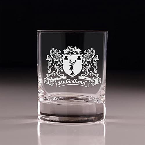 Mulholland Irish Coat of Arms Old Fashioned Tumblers - Set of 4. Sometimes, bigger is better! These taller, wider tumbler glasses are perfect for craft cocktails and whiskey. It's larger size allows room for our fan favorite "Lions" design, which is expertly and permanently sand-etched into each tumbler with your very own Irish Coat of Arms and Surname! These lavish Master's Reserve glasses undergo DuraTemp treatment to increase chip resistance, feature a clean beadless rim, thin walls, and a heavy base with a luxurious feel. Each glass was made to complement your finest whiskies and elevate the presentation and experience of your drink.