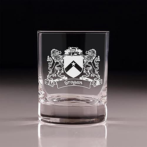 Grogan Irish Coat of Arms Old Fashioned Tumblers - Set of 4. Sometimes, bigger is better! These taller, wider tumbler glasses are perfect for craft cocktails and whiskey. It's larger size allows room for our fan favorite "Lions" design, which is expertly and permanently sand-etched into each tumbler with your very own Irish Coat of Arms and Surname! These lavish Master's Reserve glasses undergo DuraTemp treatment to increase chip resistance, feature a clean beadless rim, thin walls, and a heavy base with a luxurious feel. Each glass was made to complement your finest whiskies and elevate the presentation and experience of your drink.