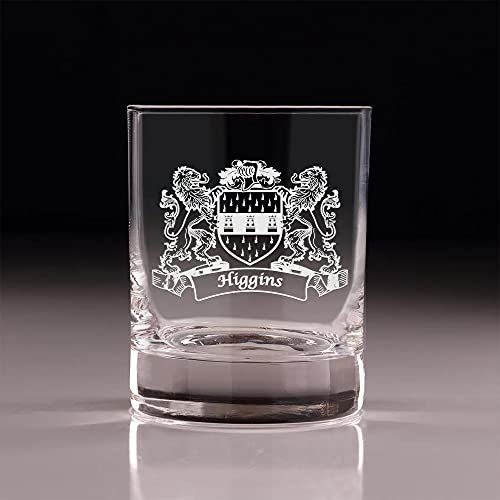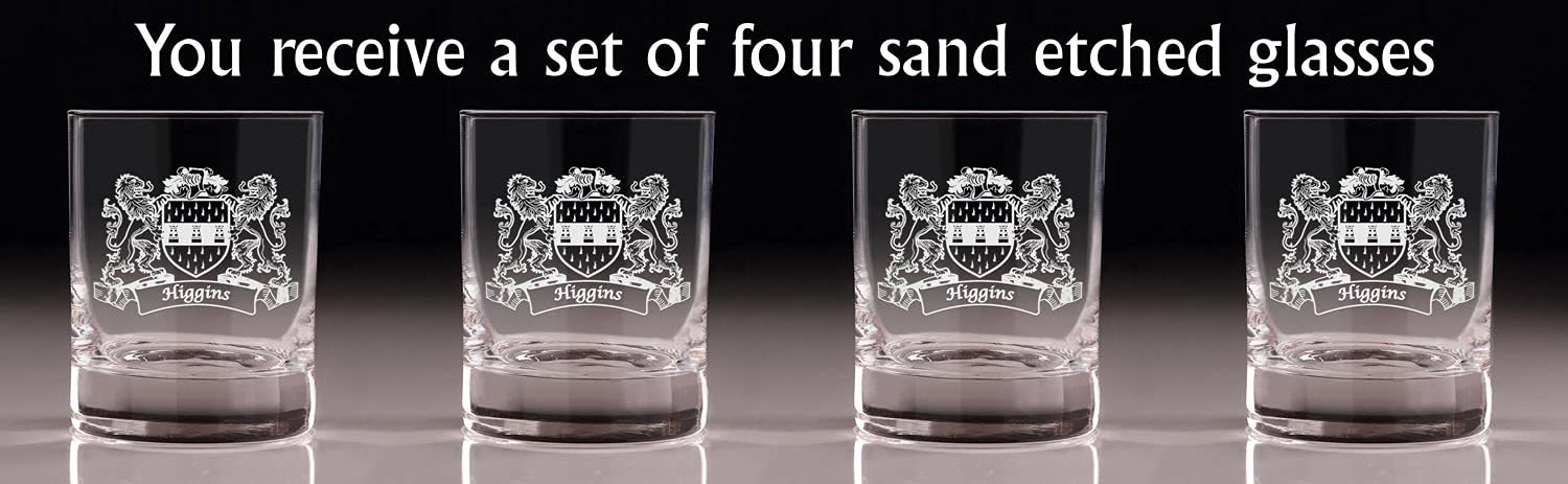 Higgins Irish Coat of Arms Old Fashioned Tumblers - Set of 4. Sometimes, bigger is better! These taller, wider tumbler glasses are perfect for craft cocktails and whiskey. It's larger size allows room for our fan favorite "Lions" design, which is expertly and permanently sand-etched into each tumbler with your very own Irish Coat of Arms and Surname! These lavish Master's Reserve glasses undergo DuraTemp treatment to increase chip resistance, feature a clean beadless rim, thin walls, and a heavy base with a luxurious feel. Each glass was made to complement your finest whiskies and elevate the presentation and experience of your drink.