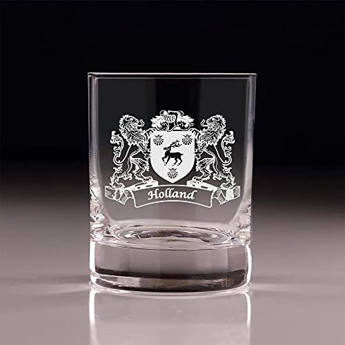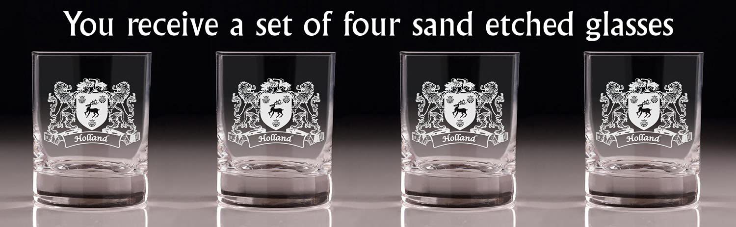 Holland Irish Coat of Arms Old Fashioned Tumblers - Set of 4. Sometimes, bigger is better! These taller, wider tumbler glasses are perfect for craft cocktails and whiskey. It's larger size allows room for our fan favorite "Lions" design, which is expertly and permanently sand-etched into each tumbler with your very own Irish Coat of Arms and Surname! These lavish Master's Reserve glasses undergo DuraTemp treatment to increase chip resistance, feature a clean beadless rim, thin walls, and a heavy base with a luxurious feel. Each glass was made to complement your finest whiskies and elevate the presentation and experience of your drink.