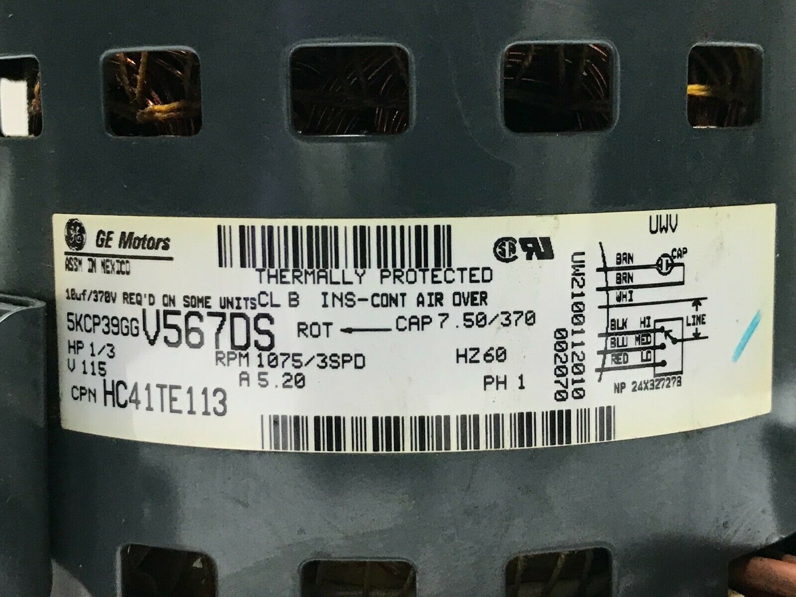 This is GE Motors 5KCP39GGV567DS Blower Motor 1/3HP 1075RPM 3SPD 115V HC41TE113 used part.