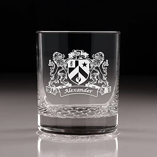 Product description: Alexander Irish Coat of Arms Nob Hill Tumblers - Set of 4. Our new Nob Hill Tumblers mix elegance with traction to make for the perfect glass! Small bumps on the underside of the glass provide stability and traction on surfaces to reduce risk of breakage while adding a sophistication and refined style. Each glass is sandblasted by hand and to order with your very own Irish coat of arms and surname in our fan-favorite "Lions" design. We pride ourselves in sourcing the best possible glassware for our designs, this tumbler being no exception! Since 1818, Libbey has been a leading distributor of glassware, providing a wide selection of durable and elegant products. These Libbey glasses feature a chip-resistant rim, unparalleled brilliance and clarity, and sturdy knobbed bases.