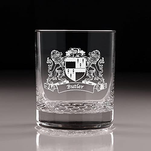 Butler Irish Coat of Arms Nob Hill Tumblers - Set of 4. Our new Nob Hill Tumblers mix elegance with traction to make for the perfect glass! Small bumps on the underside of the glass provide stability and traction on surfaces to reduce risk of breakage while adding a sophistication and refined style. Each glass is sandblasted by hand and to order with your very own Irish coat of arms and surname in our fan-favorite "Lions" design. We pride ourselves in sourcing the best possible glassware for our designs, this tumbler being no exception! Since 1818, Libbey has been a leading distributor of glassware, providing a wide selection of durable and elegant products. These Libbey glasses feature a chip-resistant rim, unparalleled brilliance and clarity, and sturdy knobbed bases.