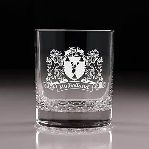 Mulholland Irish Coat of Arms Nob Hill Tumblers - Set of 4. Our new Nob Hill Tumblers mix elegance with traction to make for the perfect glass! Small bumps on the underside of the glass provide stability and traction on surfaces to reduce risk of breakage while adding a sophistication and refined style. Each glass is sandblasted by hand and to order with your very own Irish coat of arms and surname in our fan-favorite "Lions" design. We pride ourselves in sourcing the best possible glassware for our designs, this tumbler being no exception! Since 1818, Libbey has been a leading distributor of glassware, providing a wide selection of durable and elegant products. These Libbey glasses feature a chip-resistant rim, unparalleled brilliance and clarity, and sturdy knobbed bases.