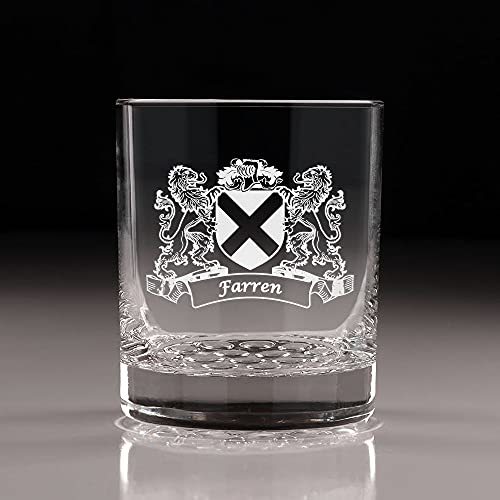 Farren Irish Coat of Arms Nob Hill Tumblers - Set of 4. Our new Nob Hill Tumblers mix elegance with traction to make for the perfect glass! Small bumps on the underside of the glass provide stability and traction on surfaces to reduce risk of breakage while adding a sophistication and refined style. Each glass is sandblasted by hand and to order with your very own Irish coat of arms and surname in our fan-favorite "Lions" design. We pride ourselves in sourcing the best possible glassware for our designs, this tumbler being no exception! Since 1818, Libbey has been a leading distributor of glassware, providing a wide selection of durable and elegant products. These Libbey glasses feature a chip-resistant rim, unparalleled brilliance and clarity, and sturdy knobbed bases.