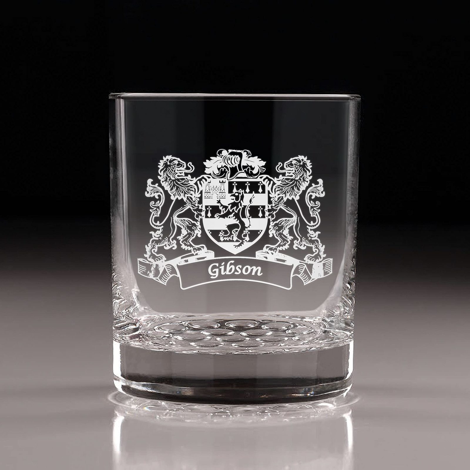 Product description: Gibson Irish Coat of Arms Nob Hill Tumblers - Set of 4. Our new Nob Hill Tumblers mix elegance with traction to make for the perfect glass! Small bumps on the underside of the glass provide stability and traction on surfaces to reduce risk of breakage while adding a sophistication and refined style. Each glass is sandblasted by hand and to order with your very own Irish coat of arms and surname in our fan-favorite "Lions" design. We pride ourselves in sourcing the best possible glassware for our designs, this tumbler being no exception! Since 1818, Libbey has been a leading distributor of glassware, providing a wide selection of durable and elegant products. These Libbey glasses feature a chip-resistant rim, unparalleled brilliance and clarity, and sturdy knobbed bases.
