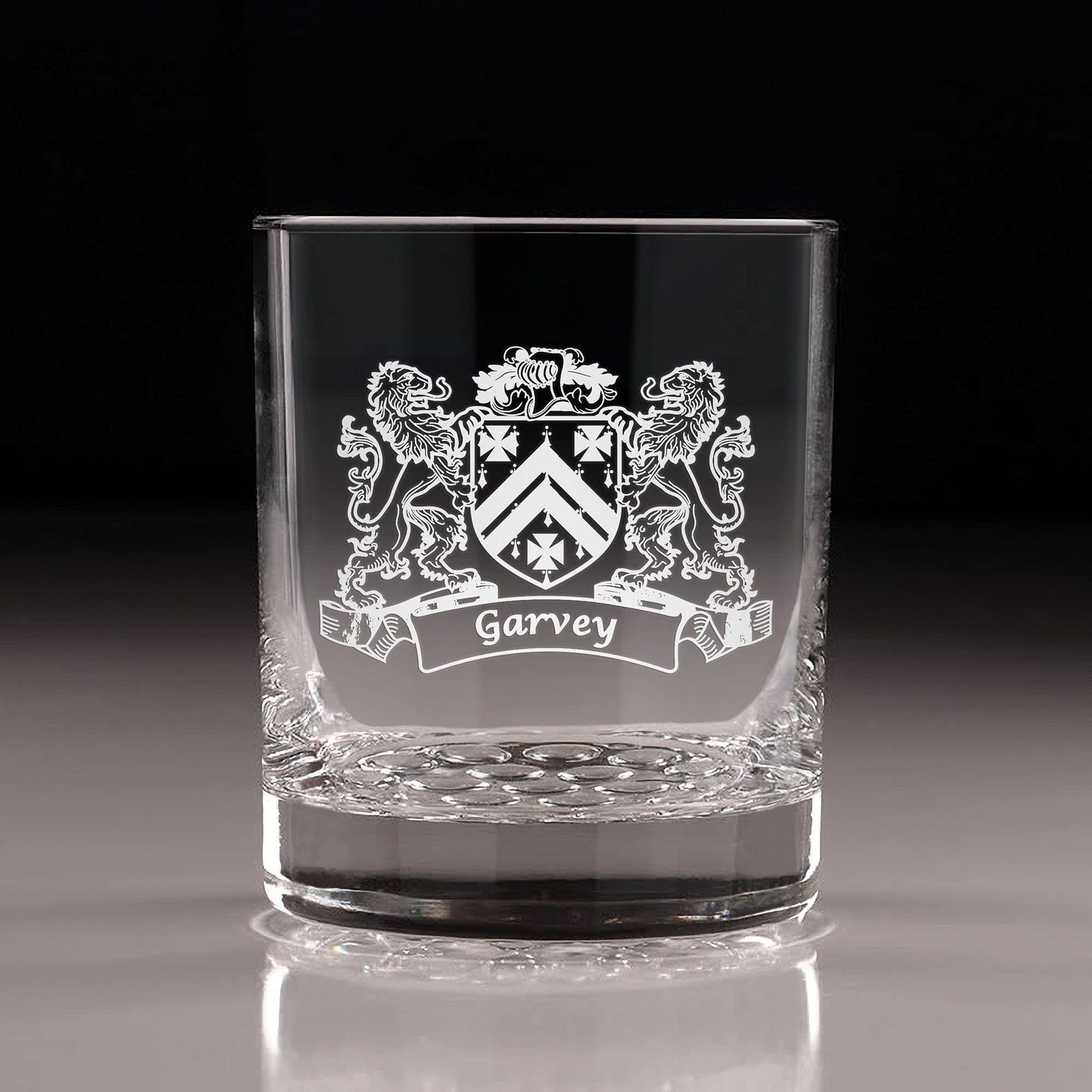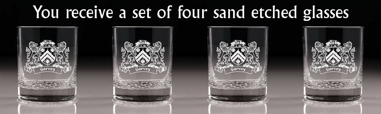 Product description: Garvey Irish Coat of Arms Nob Hill Tumblers - Set of 4. Our new Nob Hill Tumblers mix elegance with traction to make for the perfect glass! Small bumps on the underside of the glass provide stability and traction on surfaces to reduce risk of breakage while adding a sophistication and refined style. Each glass is sandblasted by hand and to order with your very own Irish coat of arms and surname in our fan-favorite "Lions" design. We pride ourselves in sourcing the best possible glassware for our designs, this tumbler being no exception! Since 1818, Libbey has been a leading distributor of glassware, providing a wide selection of durable and elegant products. These Libbey glasses feature a chip-resistant rim, unparalleled brilliance and clarity, and sturdy knobbed bases.