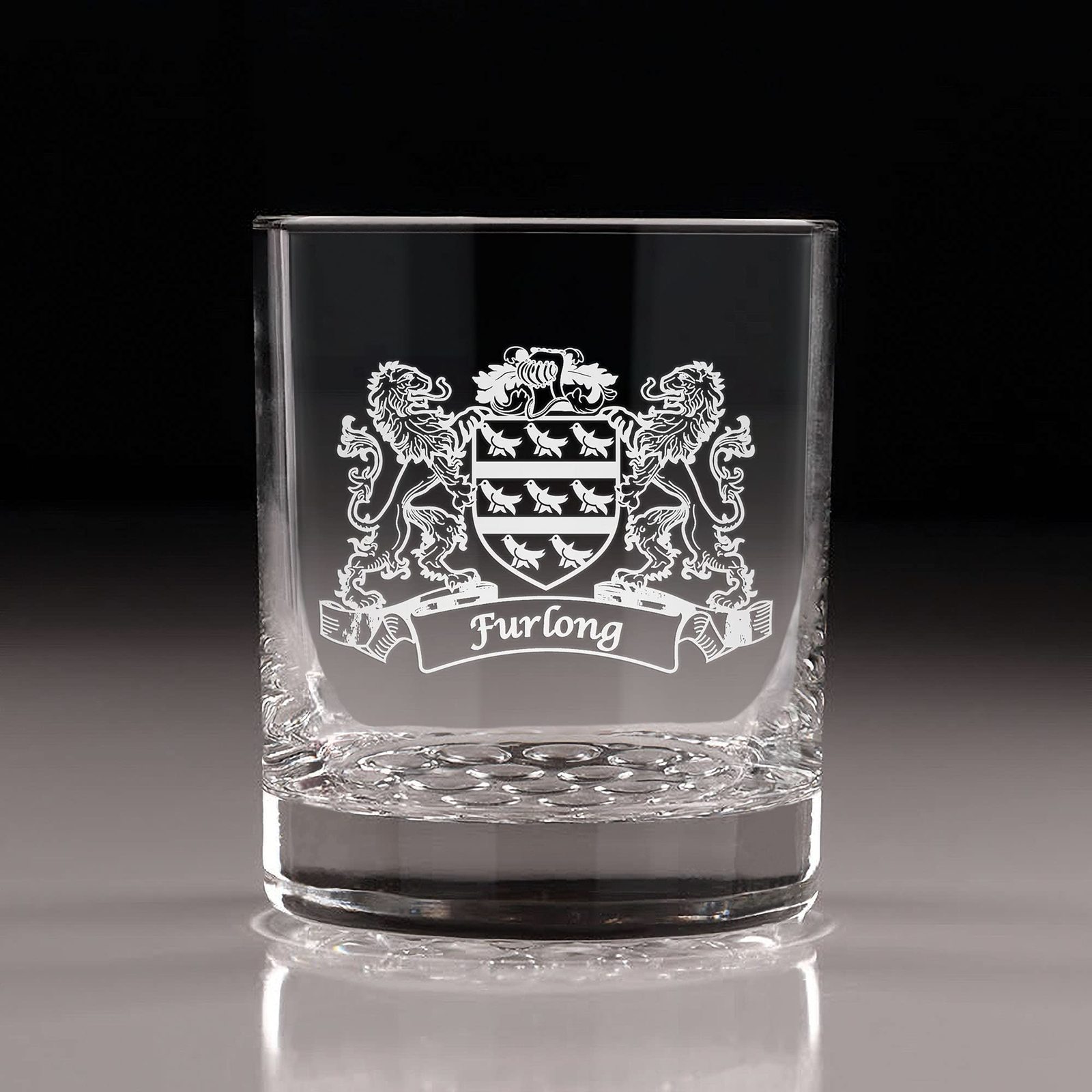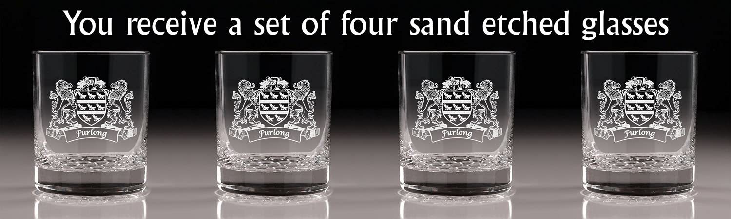 Product description: Furlong Irish Coat of Arms Nob Hill Tumblers - Set of 4. Our new Nob Hill Tumblers mix elegance with traction to make for the perfect glass! Small bumps on the underside of the glass provide stability and traction on surfaces to reduce risk of breakage while adding a sophistication and refined style. Each glass is sandblasted by hand and to order with your very own Irish coat of arms and surname in our fan-favorite "Lions" design. We pride ourselves in sourcing the best possible glassware for our designs, this tumbler being no exception! Since 1818, Libbey has been a leading distributor of glassware, providing a wide selection of durable and elegant products. These Libbey glasses feature a chip-resistant rim, unparalleled brilliance and clarity, and sturdy knobbed bases.